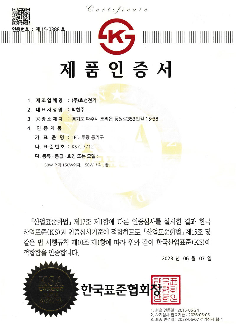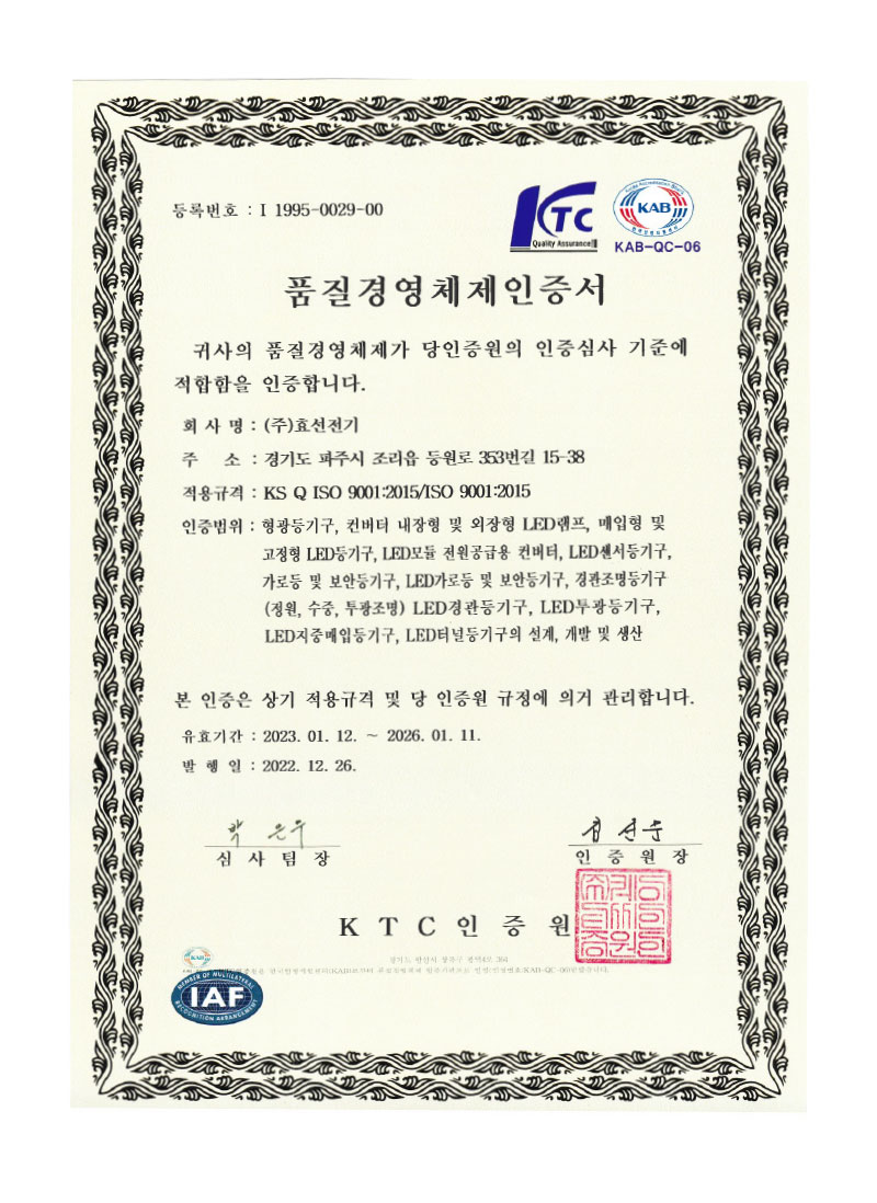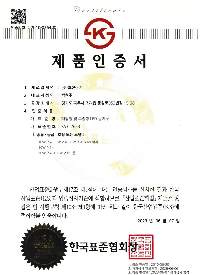 Çѱ¹µµ·Î°ø»ç Ç¥ÁØ LED Á¶¸íµî±â±¸ ÀÎÁõ¼