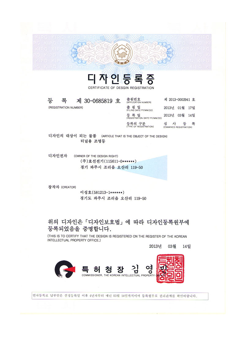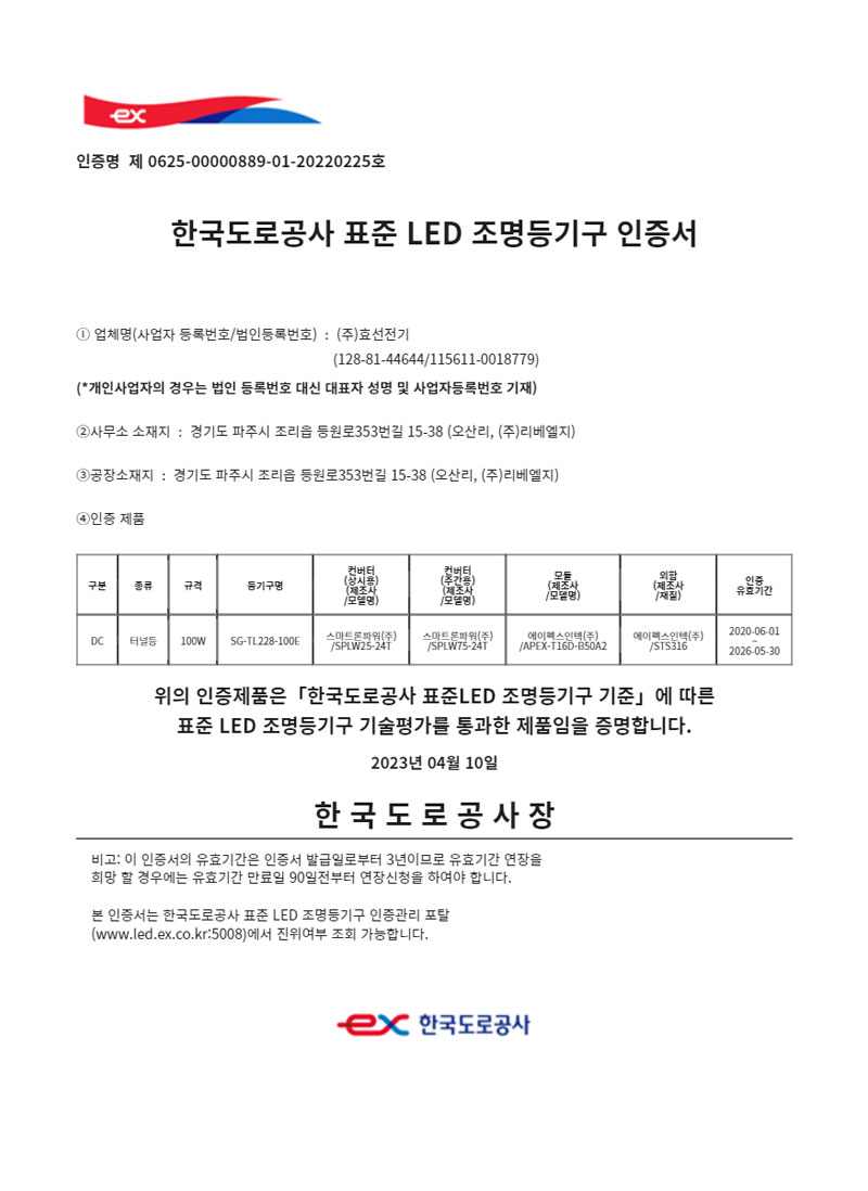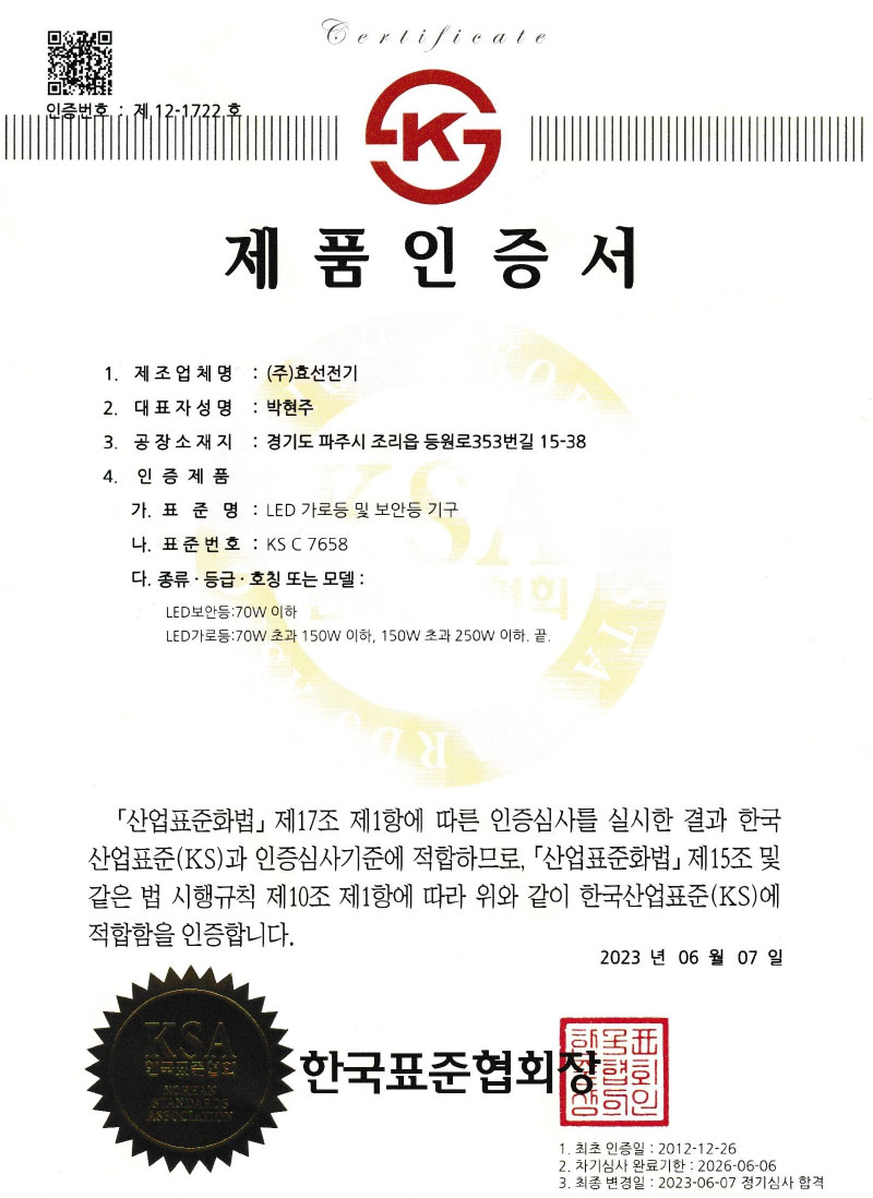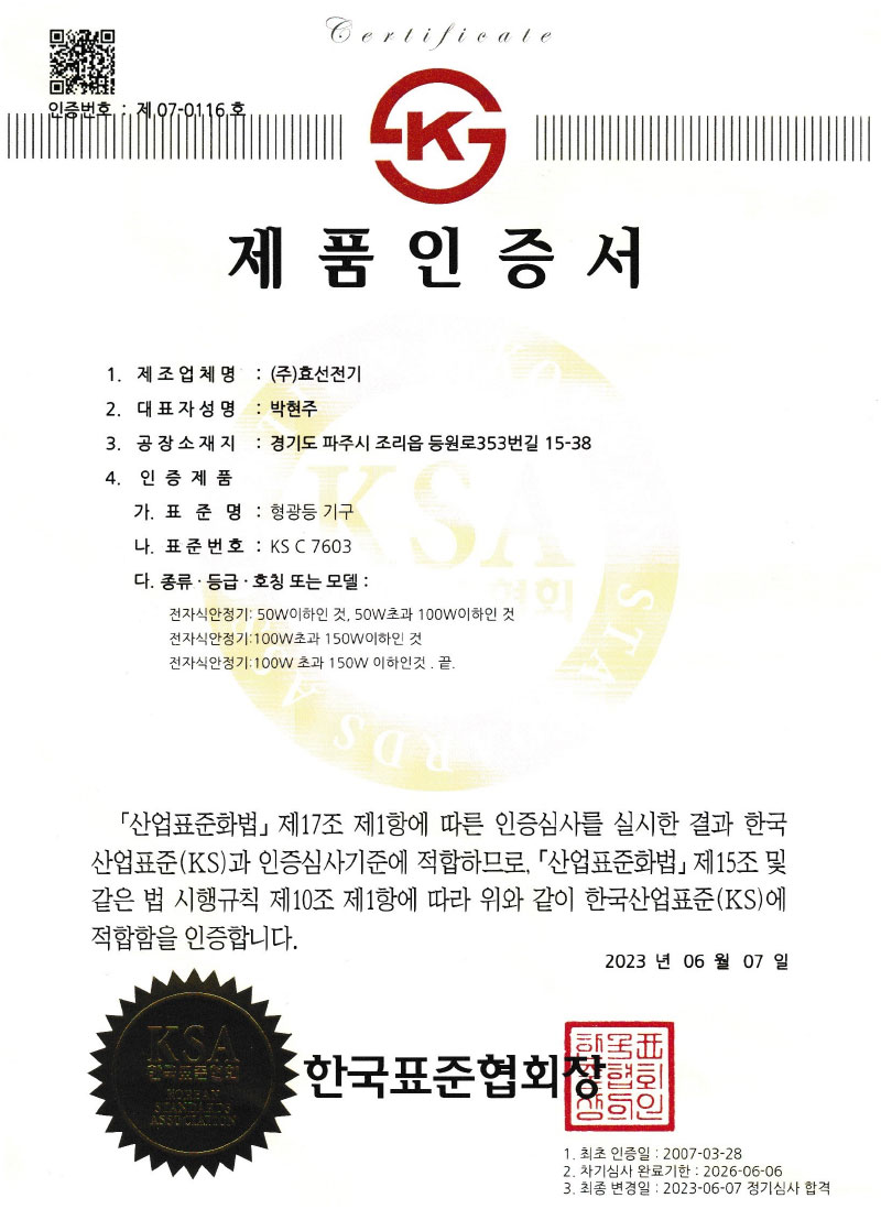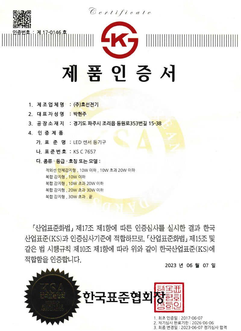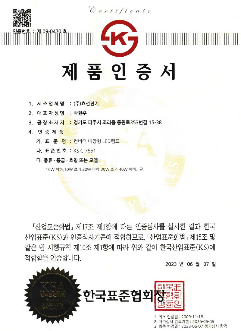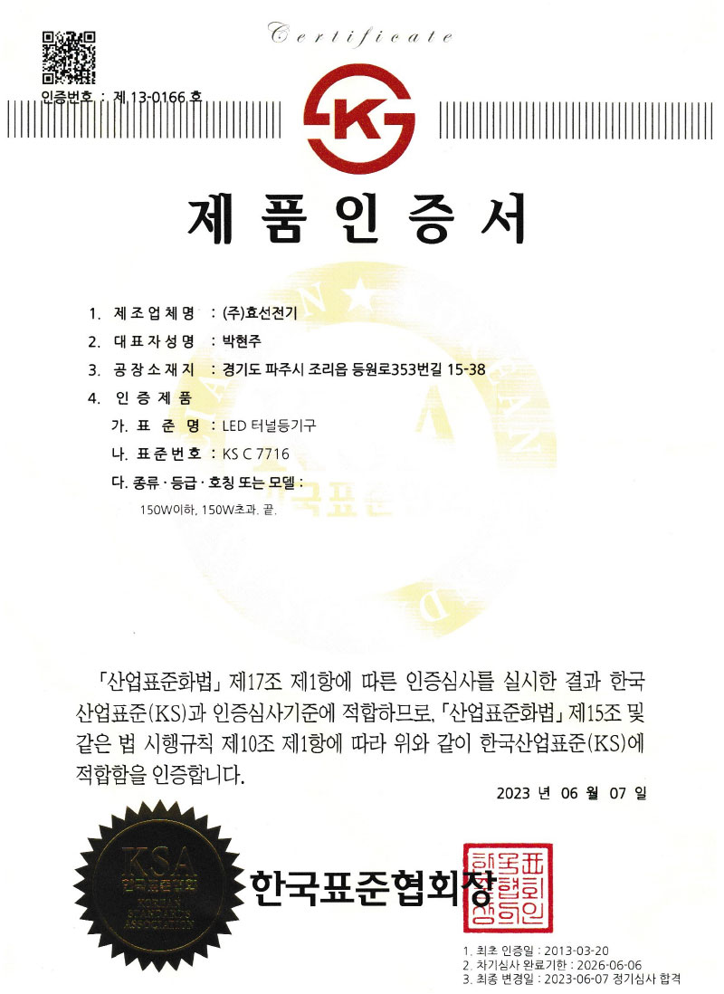 Çѱ¹µµ·Î°ø»ç Ç¥ÁØ LED Á¶¸íµî±â±¸ ÀÎÁõ¼